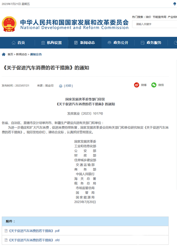国家发展改革委等部门印发《关于促进汽车消费的若干措施》的通知