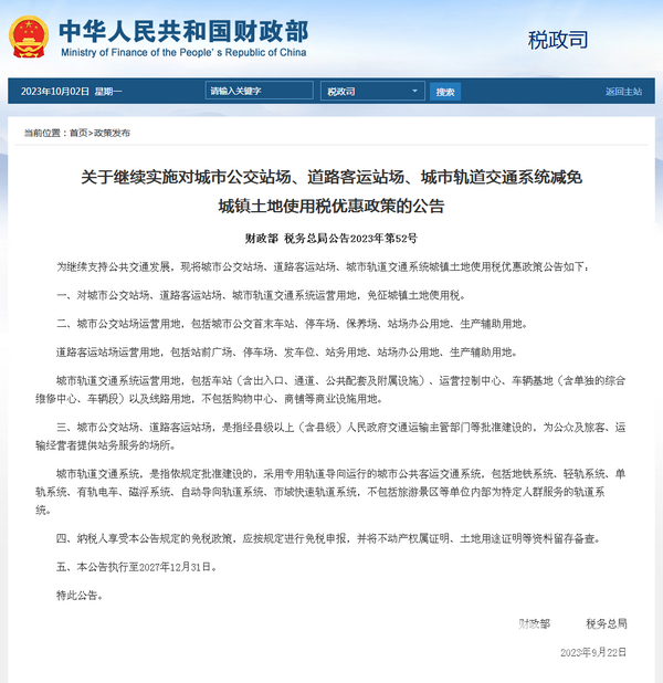 财政部:城市公交站场、道路客运站场土地使用税优惠政策继续实施