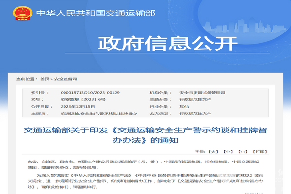 交通运输部:《交通运输安全生产警示约谈和挂牌督办办法》发布