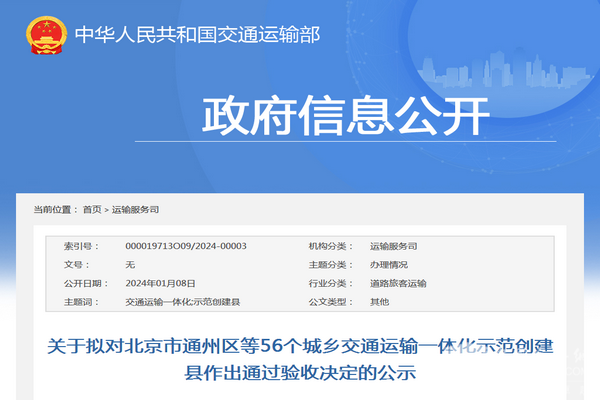 关于拟对北京市通州区等56个城乡交通运输一体化示范创建