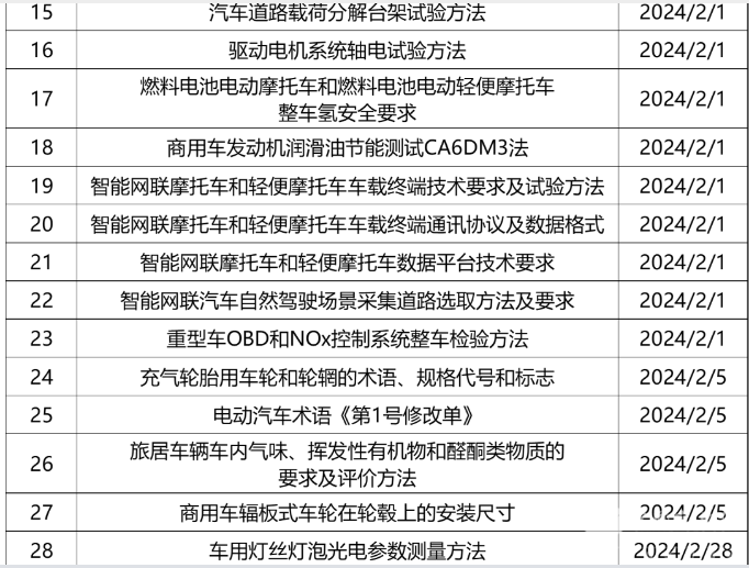 2024月份有大量征求意见稿发布(共计28个),内容包含零部件、动力电池、自动驾驶等方面,其中部分在月初征求意见的法规已在月底正式定稿发布,发布标准如下: