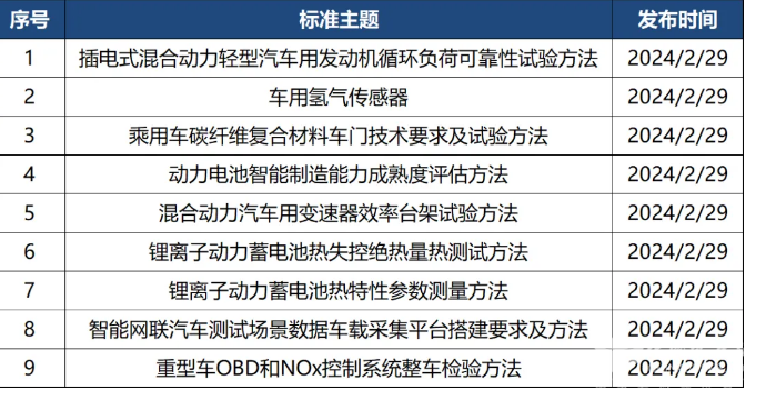 2024年2月:共有正式发布的汽车行业相关标准9部,内容包含传感器、动力电池、材料等,发布标准如下
