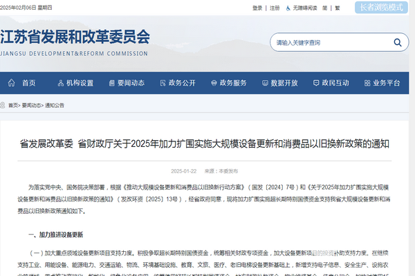 2025年1月18日,江苏省发展改革委、江苏省财政厅联合印发了关于《2025年加力扩围实施大规模设备更新和消费品以旧换新政策》的通知【苏发改资环发〔2025〕59号】。