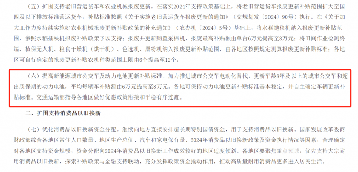 1. 新能源公交补贴力度提升:车龄8年及以上城市公交车和超质保期动力电池的更新补贴从平均每辆6万元提高至8万元,并鼓励低地板、低入口等先进车型的推广。