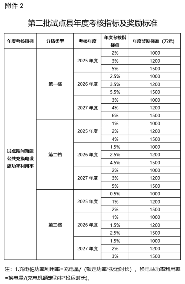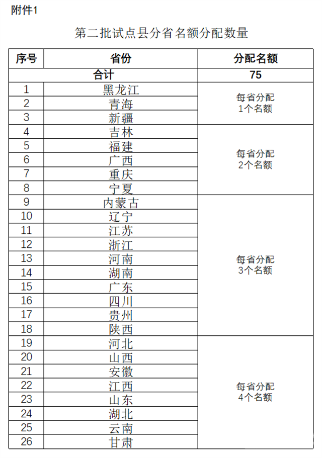 二、科学确定试点名额。2025年计划支持75个试点县。三部门根据地方当前新能源汽车和公共充换电设施发展状况及未来潜力、地域面积、省内县(县级市)数量、当前财力状况、2024年试点省公共充换电设施接入新能源汽车公共充换电基础设施奖励资金清算平台(以下简称清算平台)情况以及2024年绩效考核结果等因素分配省级试点县名额(见附件1)。