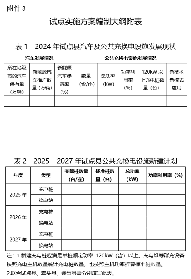 六、关于其他申报要求。各省应按照《试点通知》有关要求,组织试点县编制试点申报实施方案(实施方案正文继续按照《试点通知》附件1,实施方案附表按照本通知附件3)。进一步加强县域充换电设施与农村公路等交通基础设施及其沿线配套设施的衔接,拓展应用场景,并统筹考虑新增公共充换电设施与既有设施的空间布局,避免重复建设,有效提升利用率。试点县可研究适当增加电动重卡充换电设施,支持重卡加快电动化。各省通过竞争性评审的方式择优确定本省试点县名单,并于2025年3月13日前将试点县名单及试点实施方案按程序上报三部门备案,相关材料电子版一并上传至清算平台。