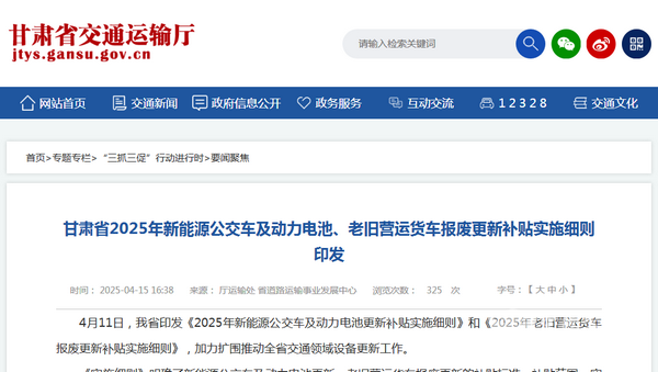 2025年4月21日,甘肃省交通运输厅、甘肃省财政厅联合印发了《甘肃省2025年新能源公交车及动力电池更新补贴实施细则》的通知。