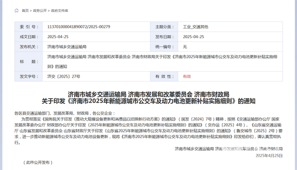2025年4月25日,济南市城乡交通运输局、济南市发展和改革委员会、济南市财政局联合印发了《济南市2025年新能源城市公交车及动力电池更新补贴实施细则》的通知【济交〔2025〕27号】。