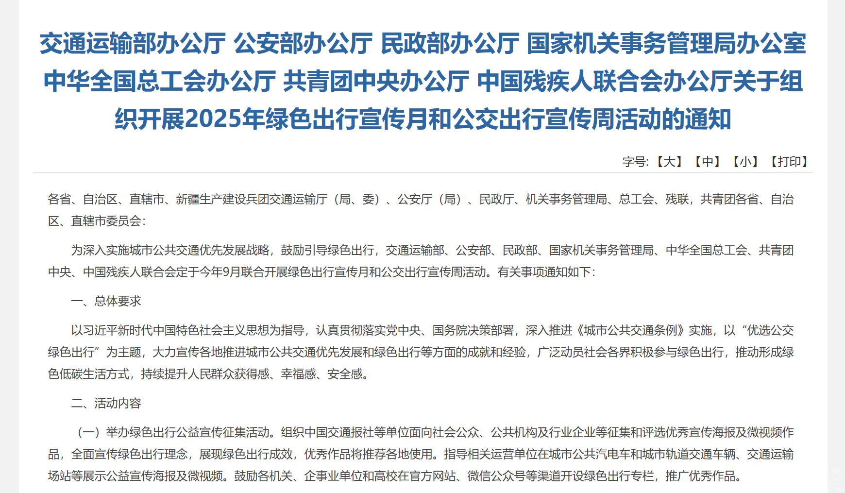 2025年8月26日,交通运输部发布《关于组织开展2025年绿色出行宣传月和公交出行宣传周活动的通知》,以下为原文: