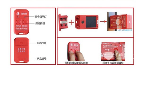 车辆着火或落水等紧急情况下,所有人员均可掀开盖子按下手动破玻按钮,破玻器自动破玻