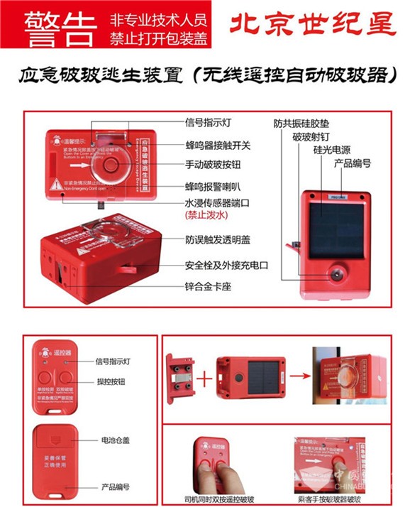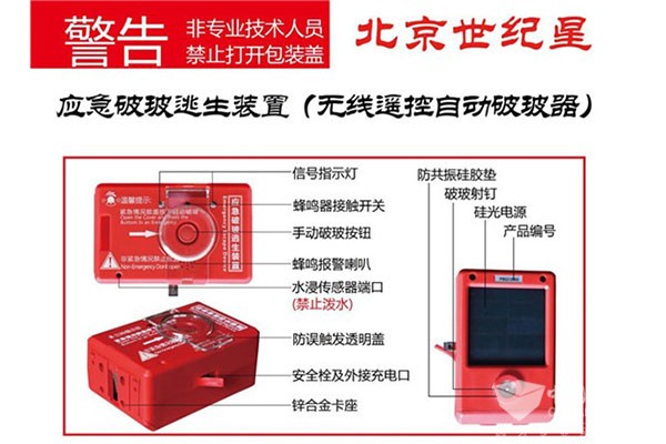 北京世纪星应急破玻逃生装置俗称自动破玻器。采用独有专利技术和最先进的工艺,无需布线。告别传统破玻器需要依赖外接电源,布线,手动操控和故障频发难检测等问题,解决了在紧急情况下钢化玻璃无法击破,不能迅速打开逃生通道的问题。广泛用于高层建筑、宾馆酒店等人员密集场所,及消防通道、排烟窗、公交、客运、旅游巴士、单位通勤车辆、校车、中巴等!