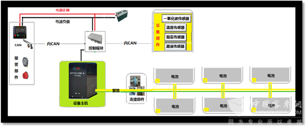 整套系统采用和整车相同的CAN通讯方式,能为整车提供系统故障报警、抑制剂喷射状态报警、电池单体异常报警、CO报警、烟温异常报警、电解液漏液报警、启动回馈报警等8种报警状态对应的报文。该项技术为国内首创、专利产品。