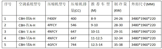 CBH并列式全新风高端大巴空调,是专门为高端大巴客车设计的一款空调,该系列空调体积小,重量轻,通用性强。适用于客运、旅游等客车车型,主要参数配置如下: