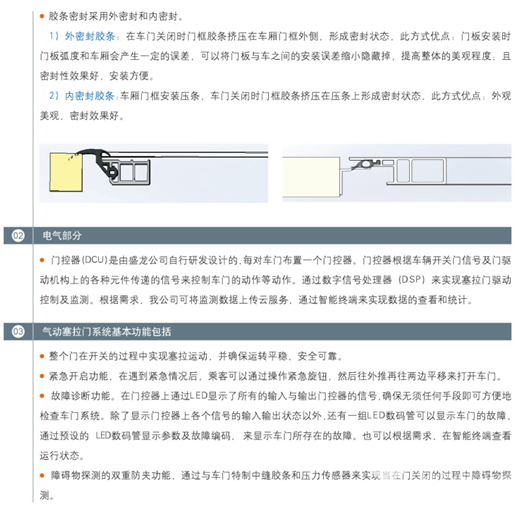 值得一提的是,该产品密封性好,节能降耗,采用全密封结构,无毛刷;具有全程防夹功能。当夹到人和物时自动打开,防夹性能符合欧标EN14752-2015要求; 安全性好。如遇突发情况门口挤满了人,内摆车门会发生打不开的情况,而塞拉门是向侧面打开,便于逃生,只要按下开门按钮或应急阀打开,门就能顺利打开,减少紧急情况下的逃生时间;外开平移结构增加了载客量、减少上下客时间。门板左右运动不占用车内空间。;车门净开度大,上下乘客便利。车门净开度可以达到门洞尺寸-200mm。