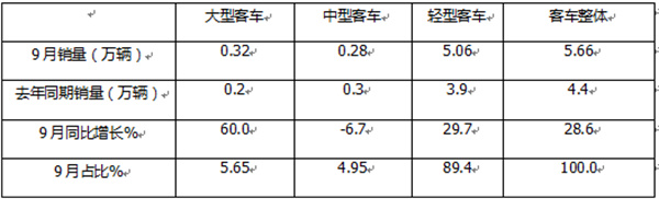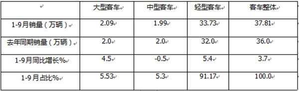 一是在高铁、航空及私家车等多元交通工具的挤压下,国内公路客车“大转小”趋势明显,特别是5-6米轻型公路客车成了市场需求的重要车型,因此推高了今年前9月轻客的销量;