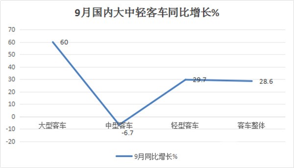 ---大型客车销售0.32万辆,同比增长60%,跑赢并领涨国内客车大盘(28.6%);市场占比5.65%。据分析主要是9月正值国庆和中秋“双节”来临的前期,旅游市场旺盛,市场对大型公路客车需求增多所致。