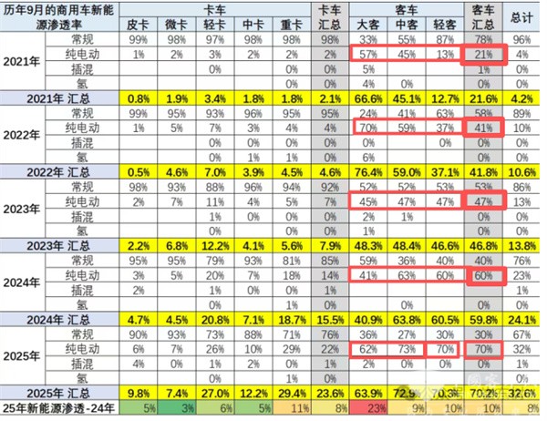 根据中国汽车流通协会提供的上牌信息(具体见截图2)可知,2025年9月国内大中轻客车各车型新能源化率: