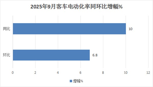 根据截图2数据可知,2025年9月国内客车电动化率为70%,环比今年8月的63.2%提升了6.8个百分点,比2024年同期的60%提升了10个百分点,呈现了同环比“双提升”的发展态势,说明今年9国内客车新能源进程正在加速推进。