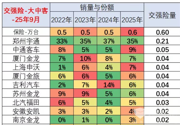 根据中国汽车流通协会提供的终端上牌数据,2025年9月国内大中型客车销量TOP10: