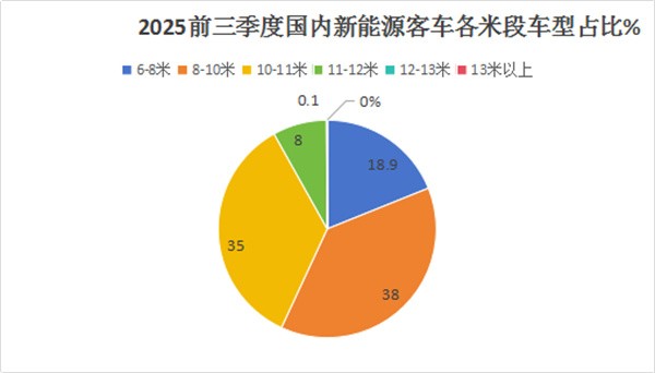 上图显示,在今年前三季度国内大中型新能源客车各米段车型中,8-10米段中型客车销售9879辆,创各米段车型销量最高,市场占比38%,因此成为最畅销的细分车型。