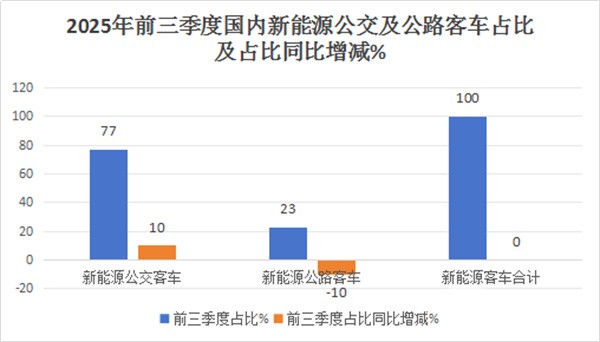 2025年前三季度,特别是前两个季度,我国旅游客运市场表现平淡,导致旅游市场对新能源公路客车的需求动力相对不足。 加之去年同期销量基数与2024年同期相比,大中型新能源公交客车的销量基数较低,而大中型新能源公路客车的销量基数较高。因此导致2025年前三季度新能源公交客车占比同比明显增加,换言之,今年前三季度我国新能源公交客车主体地位同比进一步增强。