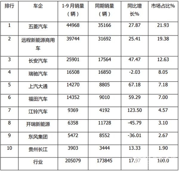 三、前9月累销:五菱\远程\长安居前三;前10累计同比7增3降,江铃菱领涨