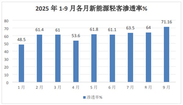 根据终端上牌信息可知,2025年9月国内新能源轻客销售3.55万辆,占据国内轻客大盘销量5.06万辆70.16%的比例,创2025年1-9月各月最高。