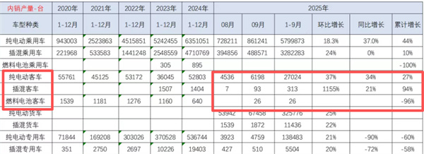 也就是说,2025年9月我国新能源客车产量主要为纯电动客车。从同环比增速看,纯电动客车产量同环比均大增,涨幅分别为34%和37%,插电式混动客车产量同比增长21%、环比暴增1155%,燃料电池客车同环比均属于净增。说明目前新能源客车厂家在2025年9月重启燃料电池客车生产。