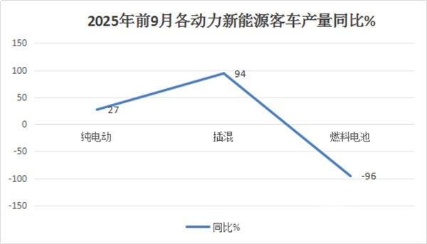 从今年前9月累计同比增速看,纯电动客车产量累计同比增长27%,插电式混动客车累计产量同比增长94%,燃料电池客车累计产量同比下降96%。