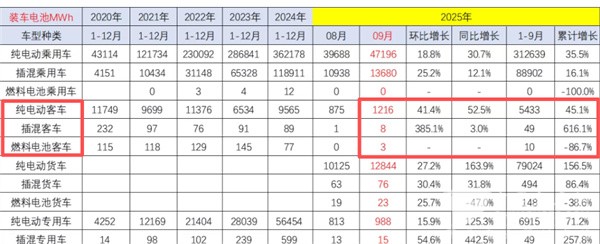 值得关注的是, 2025年9月我国新能源客车动力电池装机量为1227MWh(将截图2中2025年9月份的纯电动客车装车量1216MWh+2025年9月的插电式混动客车装车量8MWh+2025年9月的燃料电池客车的装车量3MWh) ,同比增长大约51%;2025年前9月新能源动力电池累计装机量大约为5492MWh(将截图2中2025年1-9月份的纯电动客车装车量5433MWh+2025年1-9月的插电式混动客车装车量49MWh+2025年1-9月的燃料电池客车的装车量10MWh),同比增长近47%。
