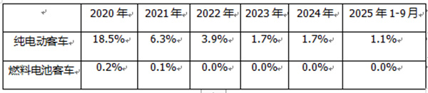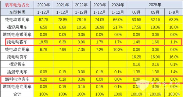 ---燃料电池客车动力电池装机量占据新能源汽车大盘的比例很少,从2020年的0.2%占比下降到2021年的0.1%占比,然后从2022年到2025年前9月占比均为零;