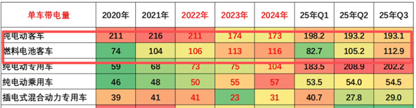 截图4,2025年前9月及近6年各类新能源客车单车平均带电量比较(数据来源:中国汽车流通协会提供)