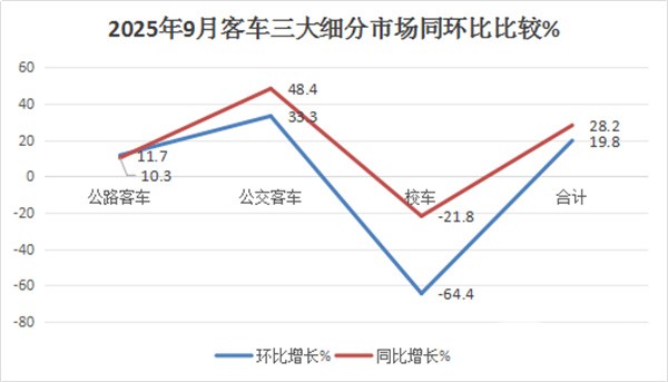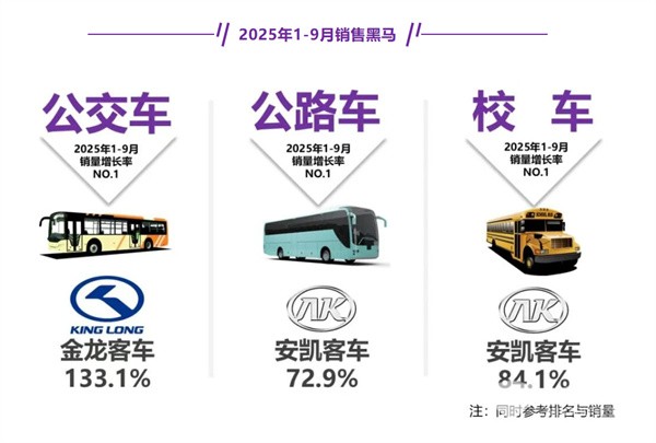 综上所述,在2025年9月及1-9月的公路、公交和校车三大客车细分市场中,公交客车均领跑。