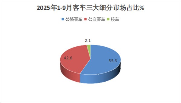 上图表可见,在2025年1-9月5米以上公路、公交、校车三大细分市场中: