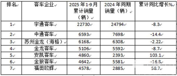 表1,根据中国客车统计信息网数据,2025年前三季度,我国公路客车主流企业TOP7销量及同比增速统计(含传动动力及新能源,只统计公路客车累计销量在4000辆以上车企):