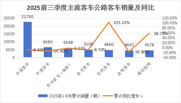 上图表显示,在2025年前三季度,我国主流客车企业公路客车销量及同比呈现以下特点: