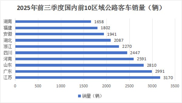 根据终端上牌数据,2025年前三季度国内5米以上公路客车累计销售3.6万辆,同比下降12%;国内前10名省级区域销量统计如下: