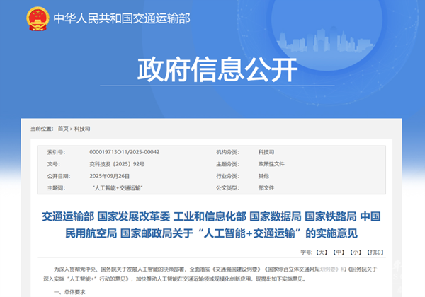 2025年9月26日,交通运输部、国家发展改革委、工业和信息化部、国家数据局、国家铁路局、中国民用航空局、国家邮政局引发《关于“人工智能+交通运输”的实施意见》,其中明确提出支持京津冀、长三角、粤港澳大湾区、成渝地区等地进一步集聚创新资源,依法依规、稳慎推进智能辅助驾驶技术示范应用。围绕大通道货车、客车等智能驾驶场景,推动实施技术测试创新。利用高速公路ETC门架等既有设施,探索采用多杆合一、多感合一等模式,科学布局车路云协同感知、控制设备与系统,改善公众出行体验。