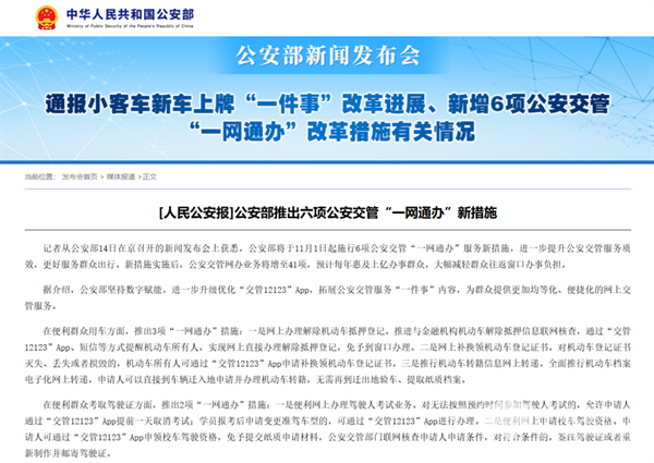 2025年10月14日,公安部召开新闻发布会,通报将自11月1日起推出6项公安交管“一网通办”服务新措施,其中包含网上办理解除机动车抵押登记、网上补换领机动车登记证书、推行机动车转籍信息网上转递、便利网上办理驾驶人考试业务、网上申请校车驾驶资格和推行网上办理大件运输车辆临时号牌。
