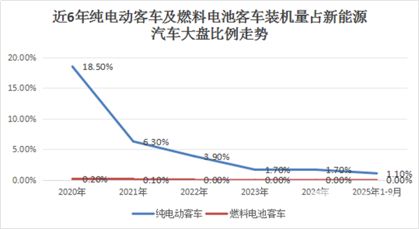 ---燃料电池客车动力电池装机量占据新能源汽车大盘的比例很少,从2020年的0.2%占比下降到2021年的0.1%占比,然后从2022年到2025年前10月占比均为零;