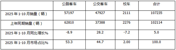 2025年1-10月5米以上客车累计销售107235辆,同比去年同期的102114辆增长5%;