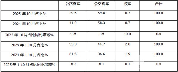 总之,无论是2025年10月还是1-10月,公路客车占比同比均减少最多,是表现最差的细分市场;而公交客车却是占比同比增加最多的细分车型,是客车三大细分市场中“最大的赢家“。