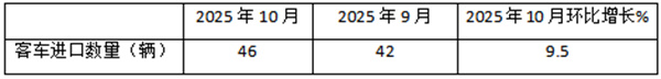 表1,根据中国汽车流通协会提供的海关数据,2025年10月我国客车进口数量环比增长44%: