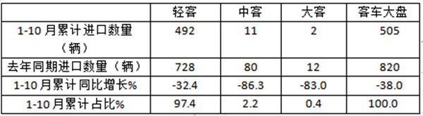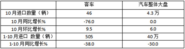 前10月我国客车进口:同比下降近4成 轻客占主体 柴油居垄断地位
