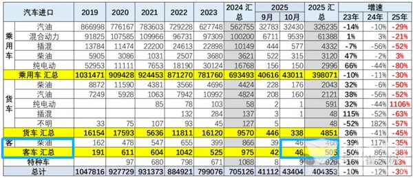 截图4,2025年10月及1-10月各种动力客车进口数量(数据来源:中国汽车流通协