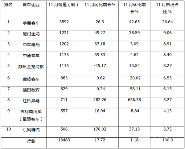 11月大中客车:同环比双增销量创新高 金龙跃升第二 中车守住第三