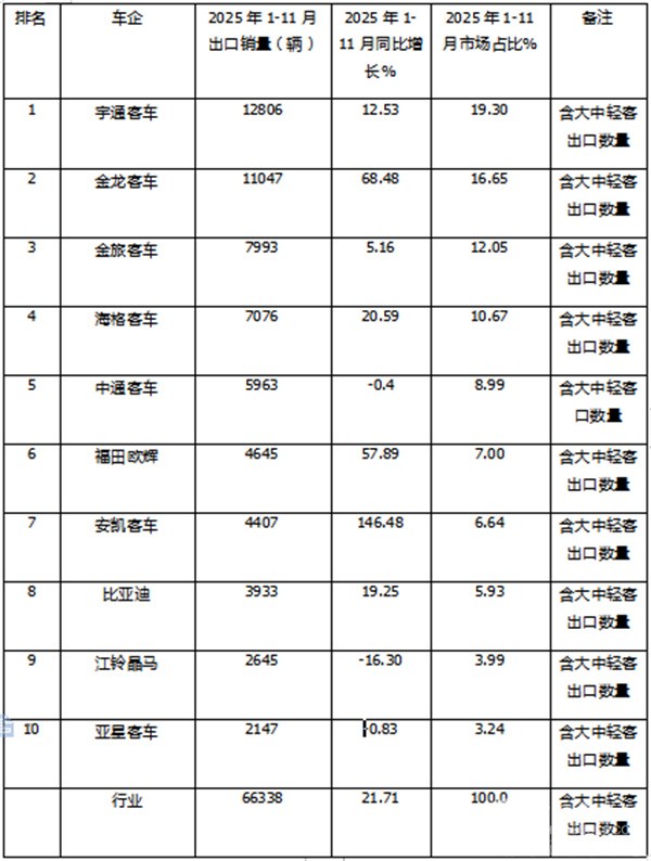 ---2025年1-11月我国客车出口同比增长21.71%,跑赢2025年1-11月我国客车大盘13.2%的同比增速。
