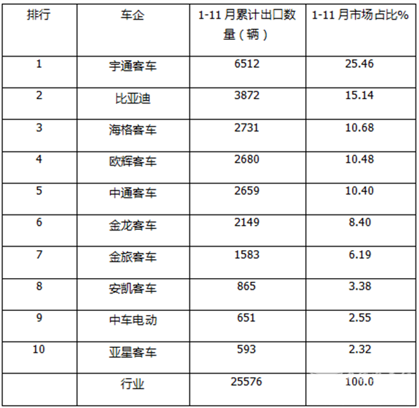 - 11月新能源客车出口:同环比双降再遇冷 比亚迪夺冠 金龙环比大涨