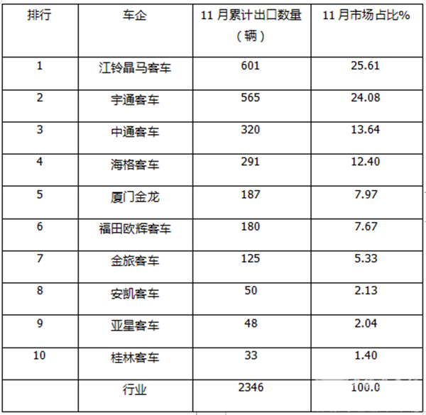 三、11月大中型座位客车出口:江铃晶马夺冠,宇通紧跟居第二,中通第三
