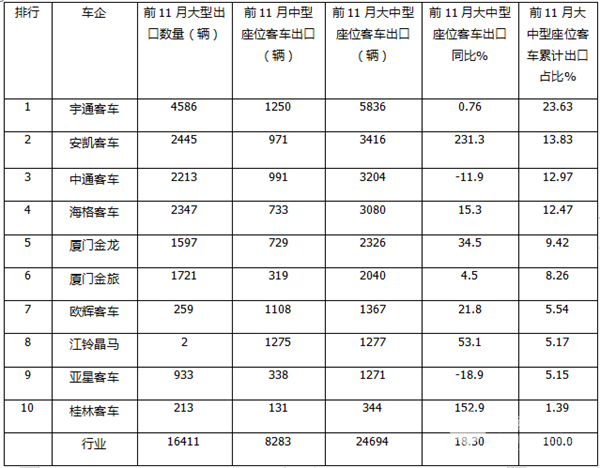 上图表可见,在2025年1-11月我国大中型座位客车出口前10车企排行中:
